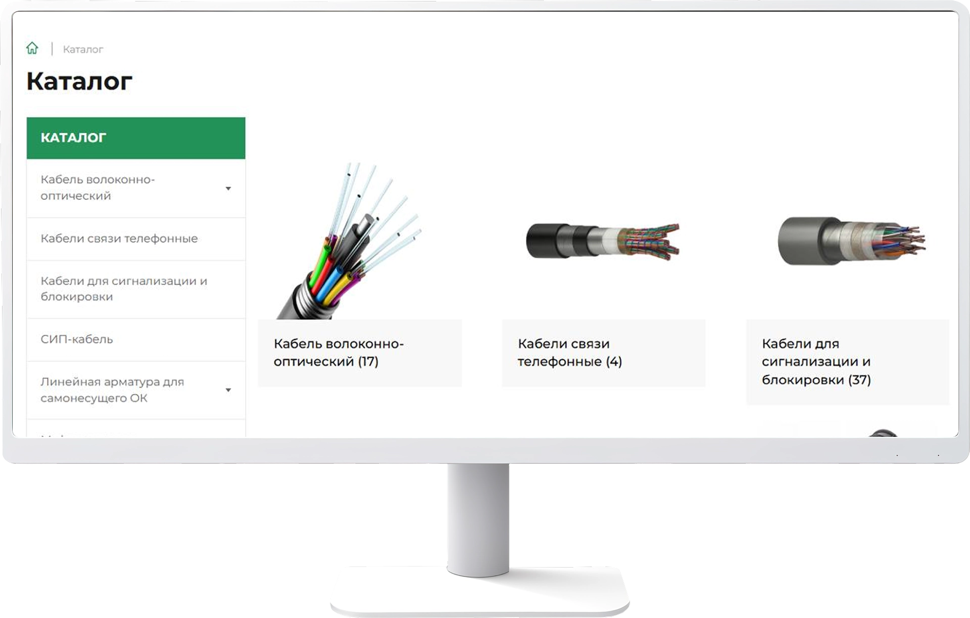 - Многоуровневое меню с категориями кабелей, комплектующих и монтажных материалов.